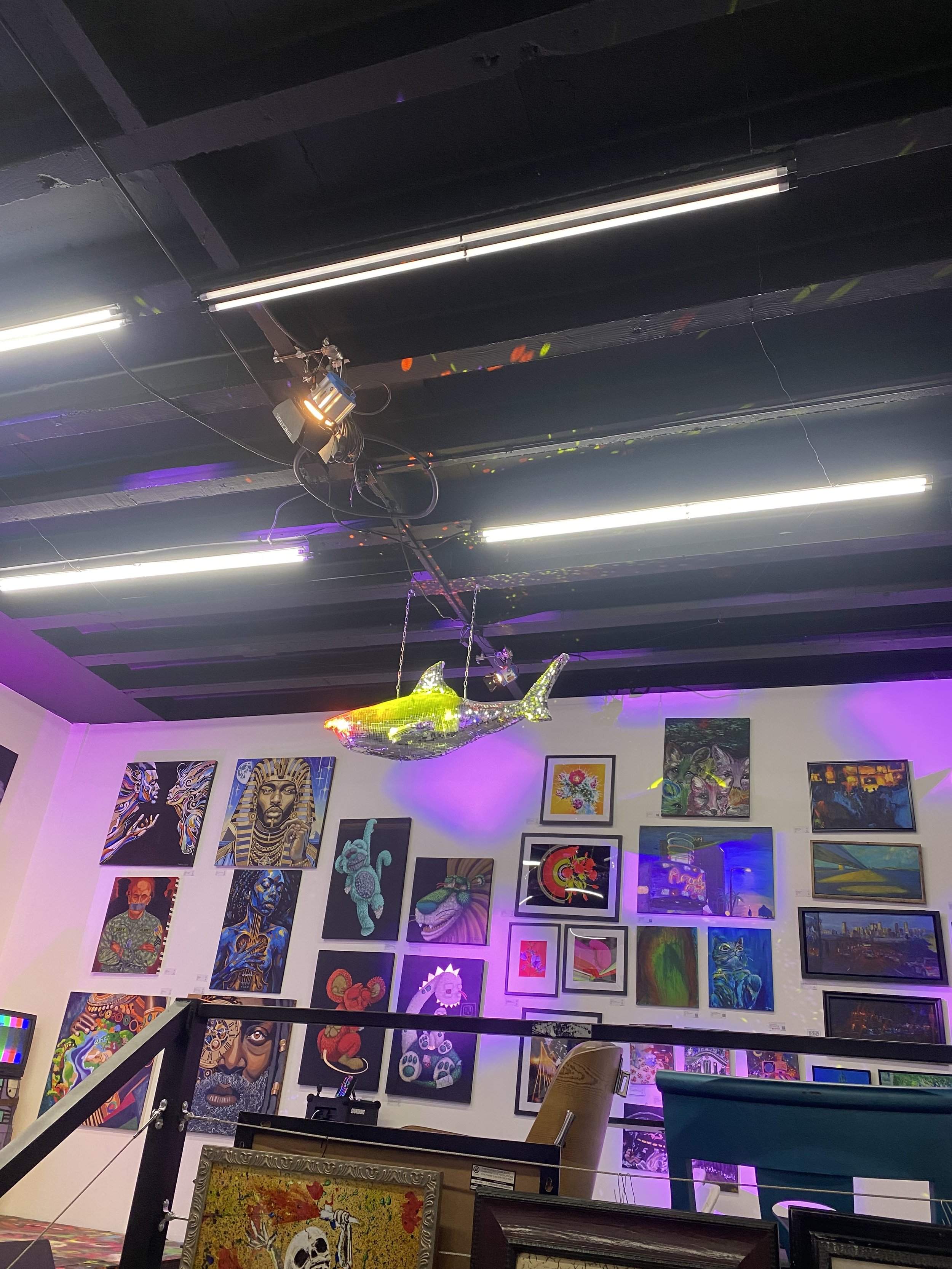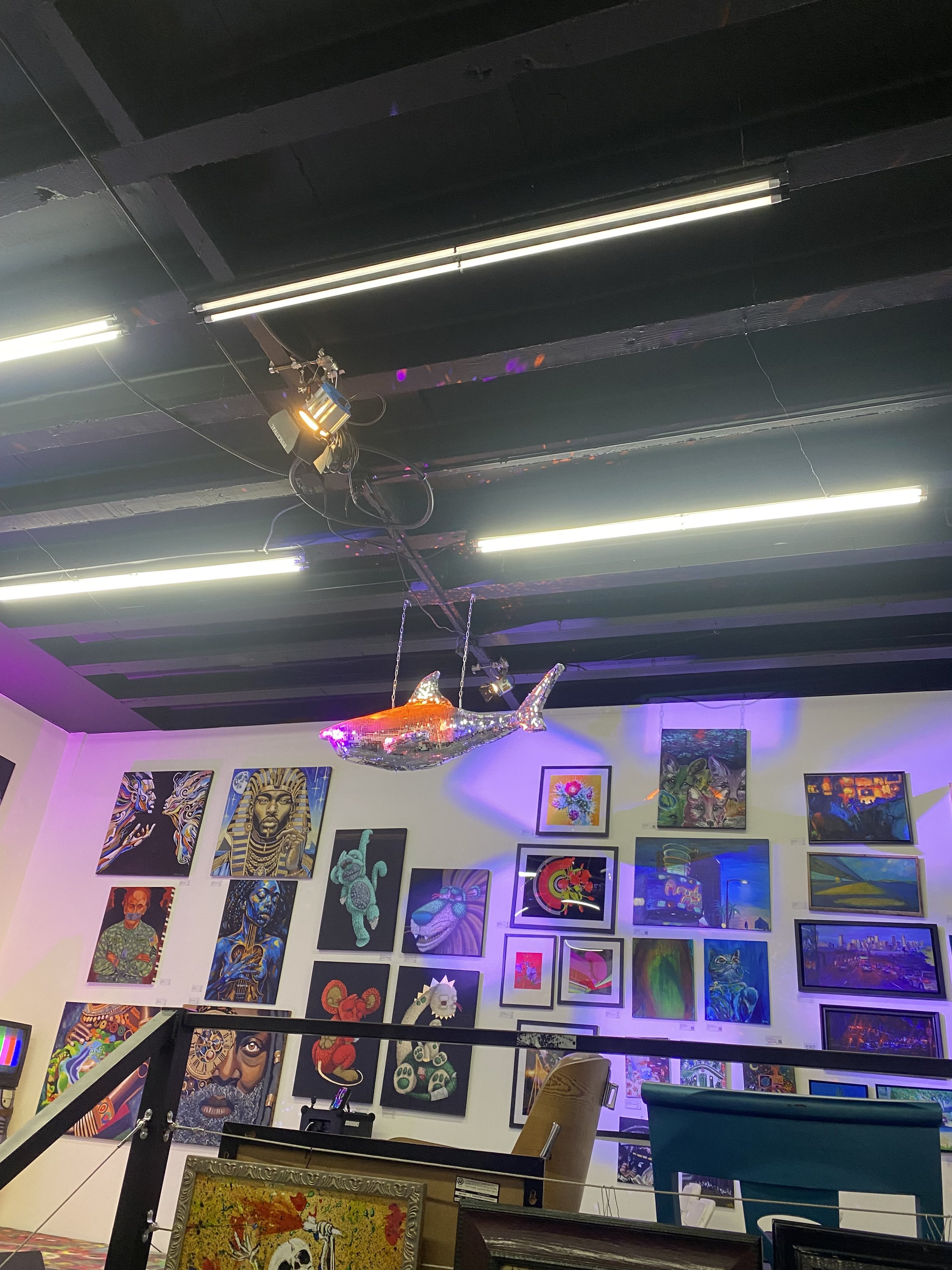 Command the room with the Disco Shark, a high-impact sculptural statement that merges apex-predator energy with late-night decadence. Created as a centerpiece for the Disco series, this 4x5’ suspended masterpiece is hand-crafted from lightweight foam and meticulously clad in hundreds of individual mirror tiles.