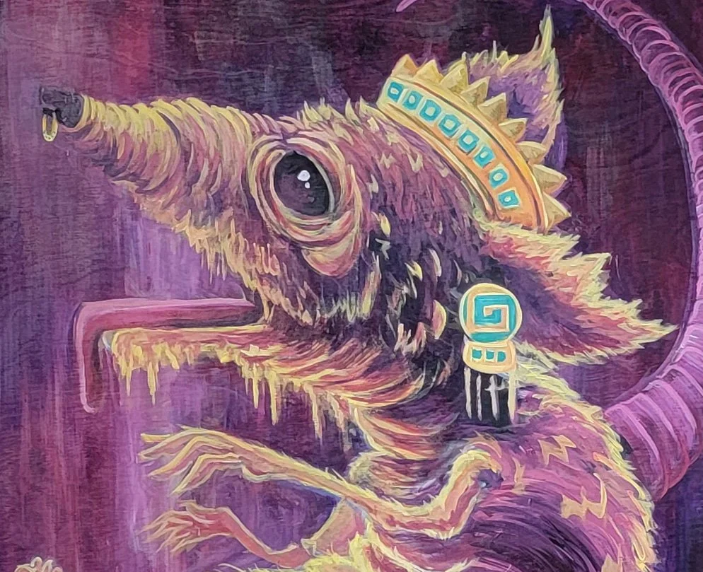 Every crown has a beginning, and every king must eventually ascend. The Rat Emperor represents a pivotal evolution in the lineage of my Rat Kings—a transformation from a collective struggle into a singular, commanding presence. Birthed in April 2025, this piece captures the moment of metamorphosis where the humble becomes heraldic. Bathed in vibrant violets and regal golds, the Emperor invites the viewer to find majesty in the misunderstood and power in the unexpected.