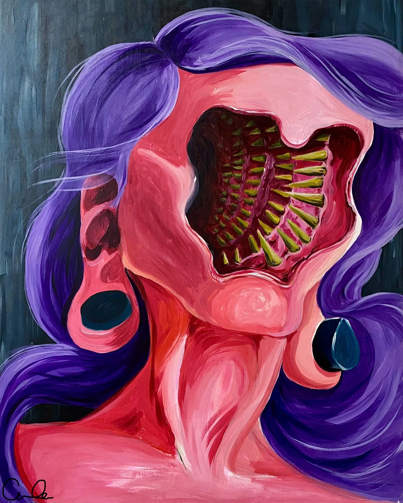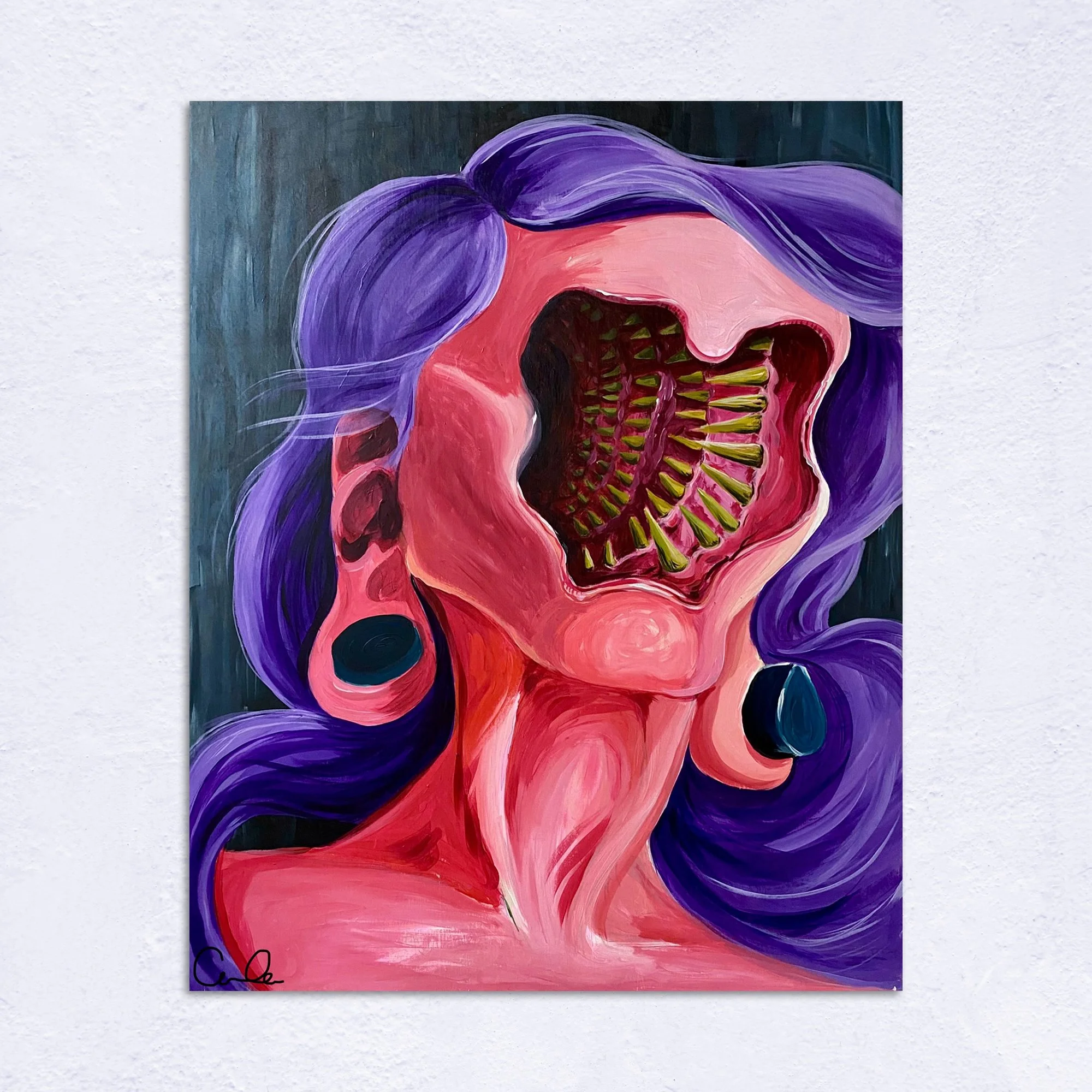 Vibrant purples and pulsating reds capture the physical intensity of a mind in labor. The exposed cranium—filled with rows of teeth—represents our most predatory and painful thoughts. It is a portrait of the persistent agony that defines the modern human condition.