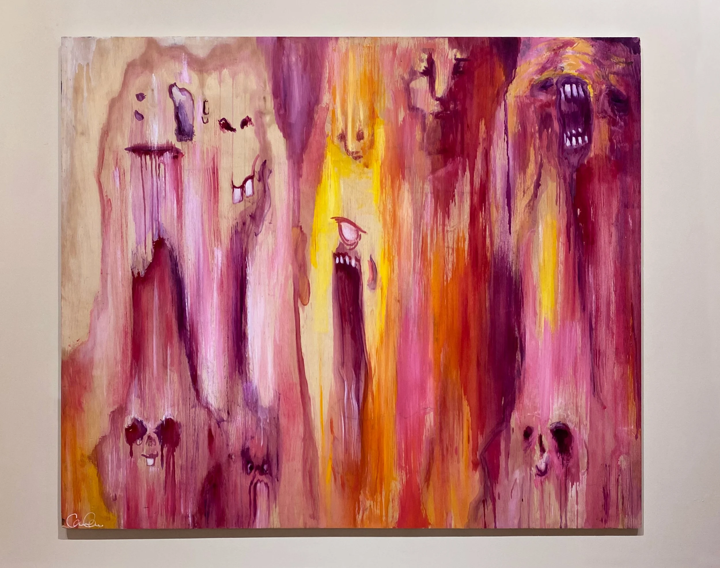 Created in the isolation of late-night hours, Sweet Tooth is a diary of rituals in the dark and the persistent, internal voices that haunt our subconscious. The composition is dominated by a haunting array of warped faces that seem to melt and scream within a heavy atmosphere of magenta, ochre, and deep violet.